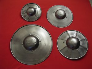 Shields were the earliest form of bodily defense and have appeared throughout the ages in a variety of shapes, sizes and materials. Depending on the period and culture, shields could be constructed of wood, bronze, iron, steel, bamboo, rattan, woven reeds, deerskin, buffalo hide, aluminum or Plexiglass. Round shields were common in many countries and were a particular favorite of the famed Viking warrior. It is this style that we primarily stock although we also carry several styles of bucklers; small shields held by a single grip and used to deflect incoming blows. Here compare the different sizes of bucklers we offer.