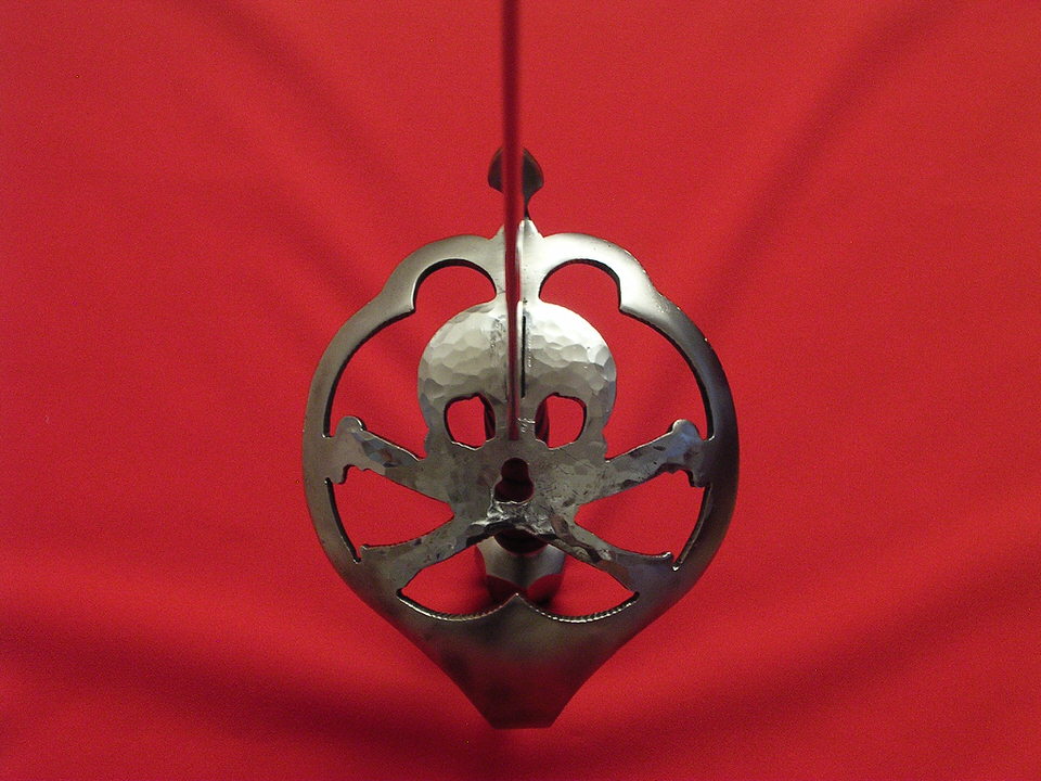 ![]() ![]() | Capt. Hook's Skull and Crossbones Cutlass | 24 inch blade; 2 ½ pounds. Fancy cutlass with skull and crossbones design available with or without the barbed tip. For other Peter Pan weapons see our Exotic Weapons page. (no scabbard available) | $10 |
